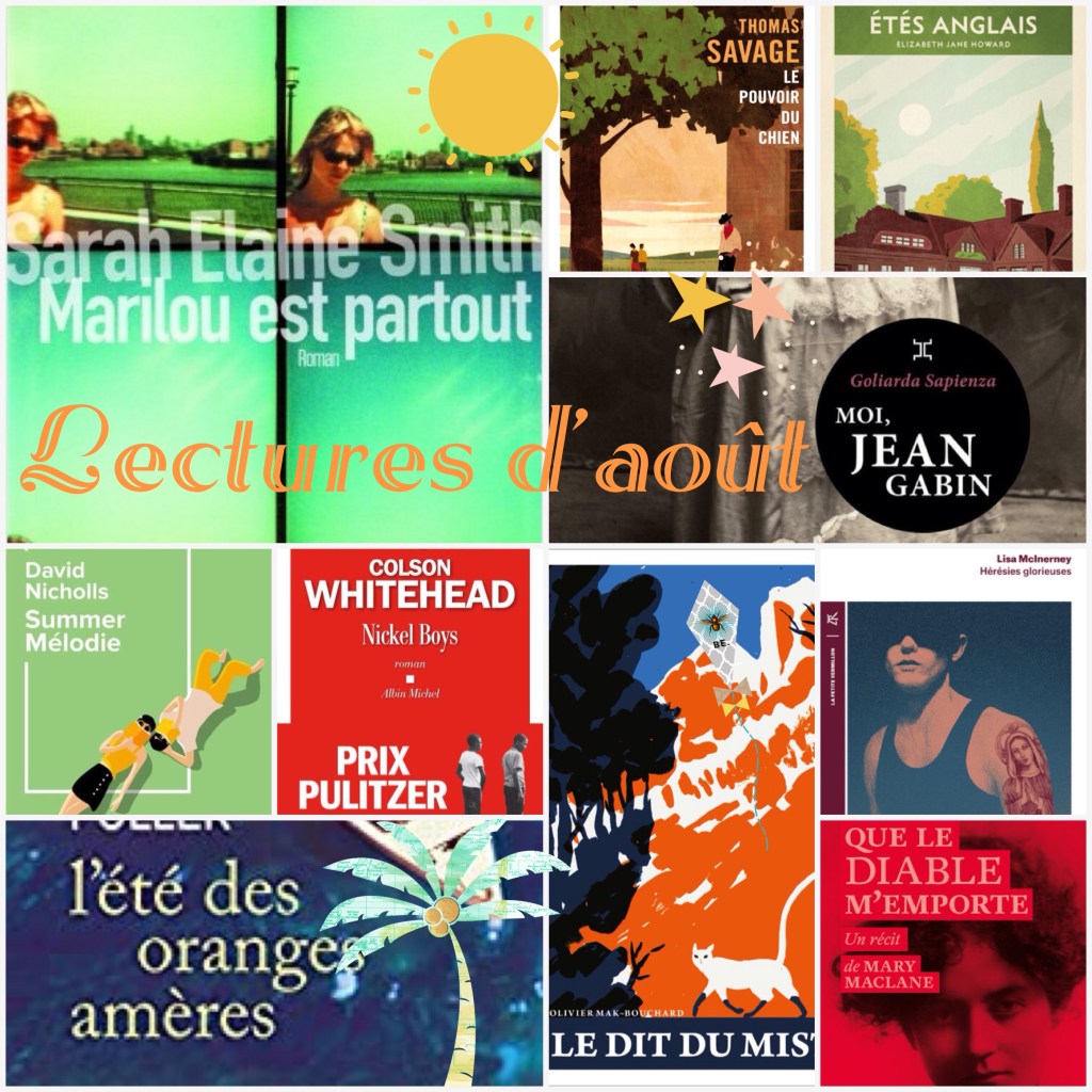 Un mois d’août bien rempli avec dix livres très éclectiques. Beaucoup de découvertes d’auteurs mais qui n’ont pas toujours été des réussites. J’ai été assez déçue par la lecture de deux romans : « L’été des oranges amères » de Claire Fuller dont l’intrigue manquait singulièrement de tension au vu de son intrigue ; « Summer mélodie » qui mêlait le bon (la description de l’adolescence et l’ennui de l’été) aux platitudes sur un 1er amour. Le reste de mes lectures fut heureusement beaucoup plus intéressant et j’ai même eu un énorme coup de cœur pour « Etés anglais » de Elizabeth Jane Howard. « Le dit du mistral », premier roman de Olivier Mak-Bouchard, fut une splendide découverte et une balade magique et envoûtante dans le Luberon. Autre formidable premier roman, celui de Sarah Elaine Smith qui nous emmène dans une Pennsylvanie rurale où une adolescente a disparu. J’ai réussi à commencer mes lectures pour le mois américain avec le dernier roman de Colson Whitehead, « Que le diable m’emporte » un autoportrait culottée de Mary MacLane écrit à 19 ans et « Le pouvoir du chien » de Thomas Savage qui s’annonce grandiose. Une fois le mois américain terminé, je vous parlerai de ma découverte de Goliarda Sapienza avec « Moi, Jean Gabin » et de Lisa McInerney avec « Hérésies glorieuses », deux livres que j’ai beaucoup aimés.
